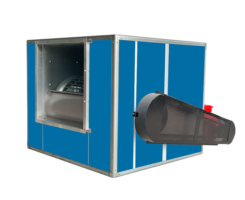 1.1.HTFC型柜式離心風(fēng)機(jī)是一種高效率、低噪聲箱式離心風(fēng)機(jī)。產(chǎn)品由低噪聲前傾多翼離心風(fēng)機(jī)、電機(jī)、軸承、傳動(dòng)件、消聲型箱體等組成。根據(jù)安裝位置的不同,提供12種不同角度的進(jìn)出風(fēng)口位置,以滿足用戶不同的安裝環(huán)境需要。根據(jù)消防與通風(fēng)的要求不同分A型和B型兩種類型,A型電機(jī)裝在箱體外,用于消防排煙,并經(jīng)國(guó)家消防裝備監(jiān)督質(zhì)量檢驗(yàn)中心按GA211-1999《消防排煙風(fēng)機(jī)耐高溫試驗(yàn)方法》進(jìn)行耐高溫試驗(yàn),能在300℃高溫條件下連續(xù)運(yùn)行60分鐘以上;B型電機(jī)裝在箱體內(nèi),用于通風(fēng)換氣。